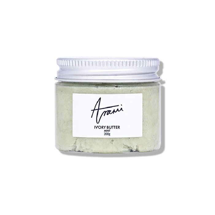 Arami Ivory Butter – Mint is a whipped blend of unrefined shea butter, olive oil, vitamin E, and freshly scented peppermint essential oil. Rich and nourishing yet softens quickly on contact, this butter deeply hydrates dry skin, smooths texture, helps fade scars and stretch marks, and leaves behind a subtle minty freshness. Ideal for use on body and hair—best applied after bathing for a soothing and cooling moisture boost