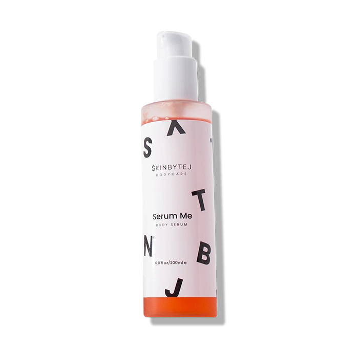 SkinByTej Serum Me is a glycolic-acid body serum that gently exfoliates to smooth roughness, fade hyperpigmentation and stretch marks, and brighten skin tone. It also contains vitamin C, vitamin E, lactic acid, hyaluronic acid, and citric acid to hydrate, protect from free radicals, and support barrier repair .